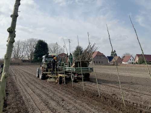 Baumpflanzung im Freiland: Die gepflanzten Jungbäume bestehen im Grunde genommen aus ein wenig Wurzelwerk, langem geradem Stamm und einigen Knospen, aus sich denen die Baumkrone entwickeln soll. Gepflanzt wird hybrid mit Pflanzmaschine und Hand-/ Fußarbeit