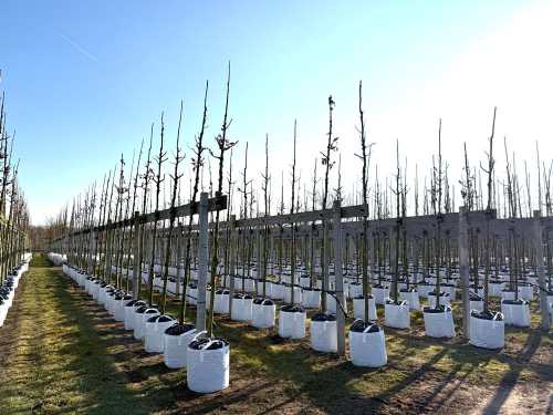 Für die Containerkultur werden die Jungbäume mit dem Wurzelwerk in die Pflanzsäcke gestellt und auf einer Rüttelplatte in Pflanzsubstrat eingetopft. Die fertig getopften Bäume werden in die Baumquartiere transportiert, aufgestellt und an die automatische Tropfberegnung angeschlossen. Da diese Bäume sich natürlich nicht über ihr Wurzelwerk im Boden verankern können, werden Containerbäume an stabile Stellagen angebunden.