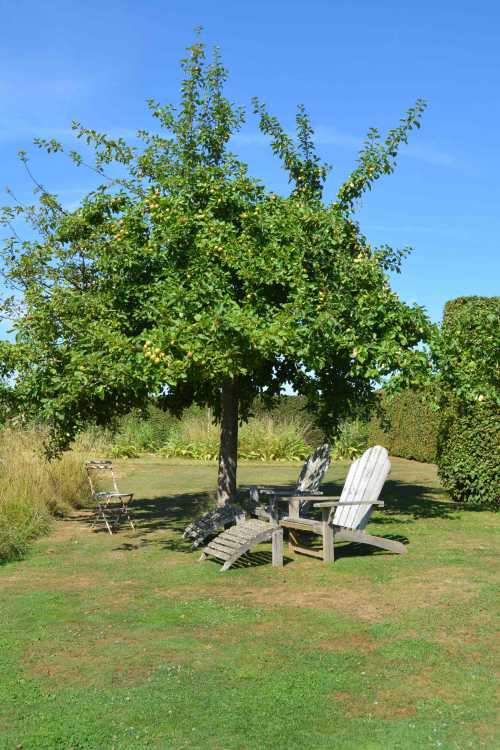 Wähle ich die Erziehungsform Hochstamm, unter dessen Krone ich hindurchsehen und hindurchgehen oder unter der ich sitzen kann? Oder habe ich so viel Platz, so dass ich auch einen Solitär oder Stammbusch (vollständig von unten her belaubt) pflanzen kann, um mich an der natürlichen Wuchsform zu erfreuen – andererseits aber einen Raum besetzen bzw. (positiv gewendet) einen Raum abgrenzen?