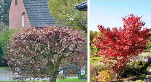 Noch ein Beispiel für kompletten Verlust des malerischen Habitus bei Acer palmatum 'Atropurpureum' im Vergleich Rundschnitt/ Keinschnitt (Bild rechts: Zoonar/ Himmelhuber)